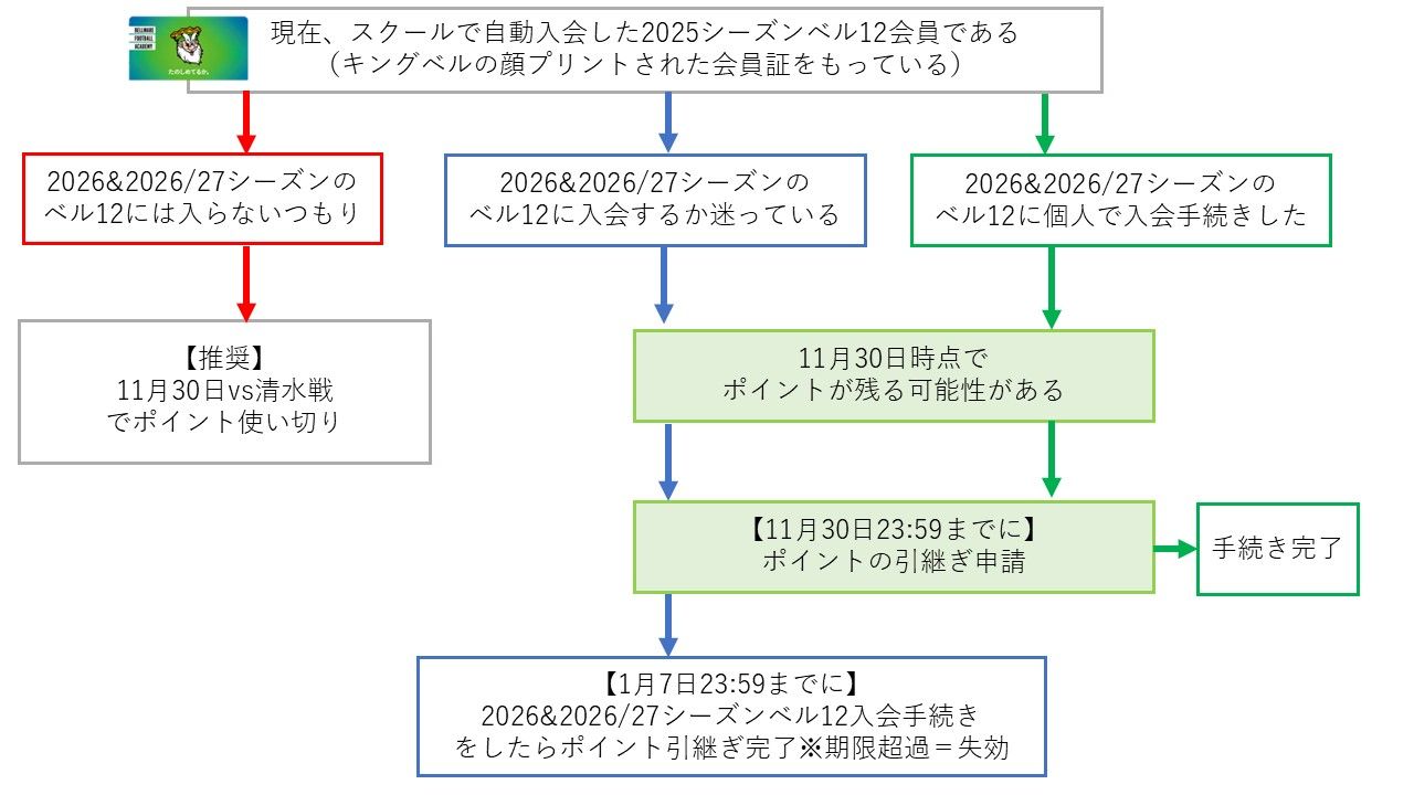 また、現在スクールで自動入会したベル12会員証(キングベルの顔がプリントされています)をお持ちのスクール生で 2026&2026/27シーズンのベル12へこれから新規入会される方/すでにご入会いただいた方には、クラブにて残ポイントの引継ぎ対応を行います