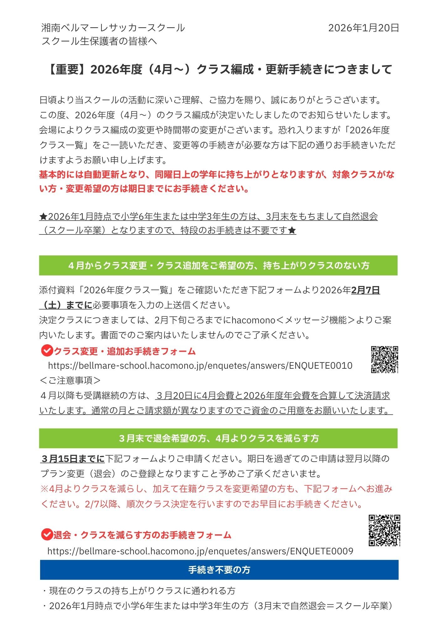 2026年度(4月~)クラス編成・更新手続きにつきまして