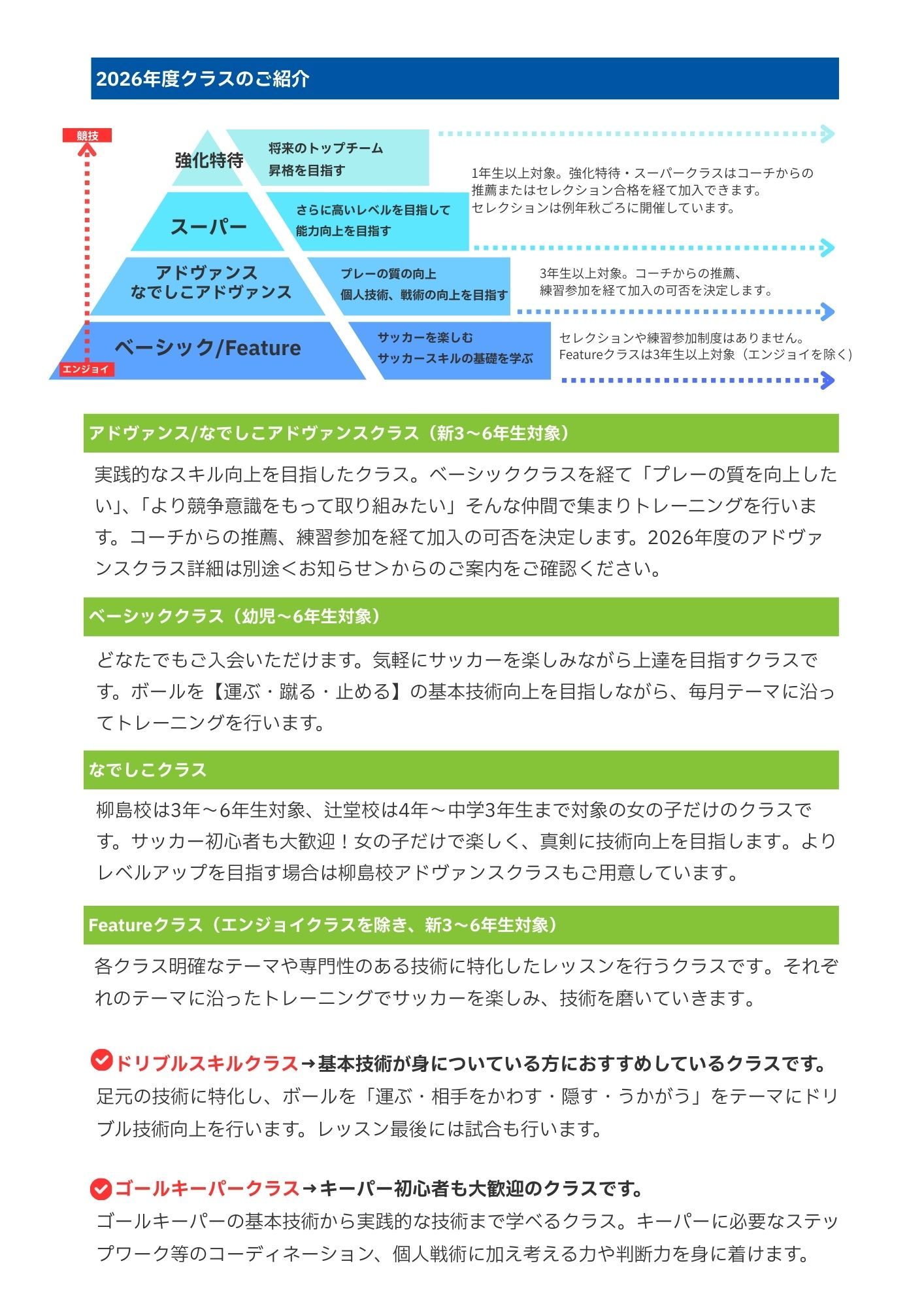 アドヴァンスクラスはコーチからの推薦、練習参加を経て合否の決定をいたします。現在ベーシッククラスにお通いでアドヴァンスクラスをご希望の方は、4月以降に希望申請いただく流れとなります。新年度からのクラスは、<現在の持ち上がりクラスまたはご希望の会場・曜日のベーシッククラス>をお選びください。アドヴァンスクラスの詳細は近日中に改めてご案内いたします。