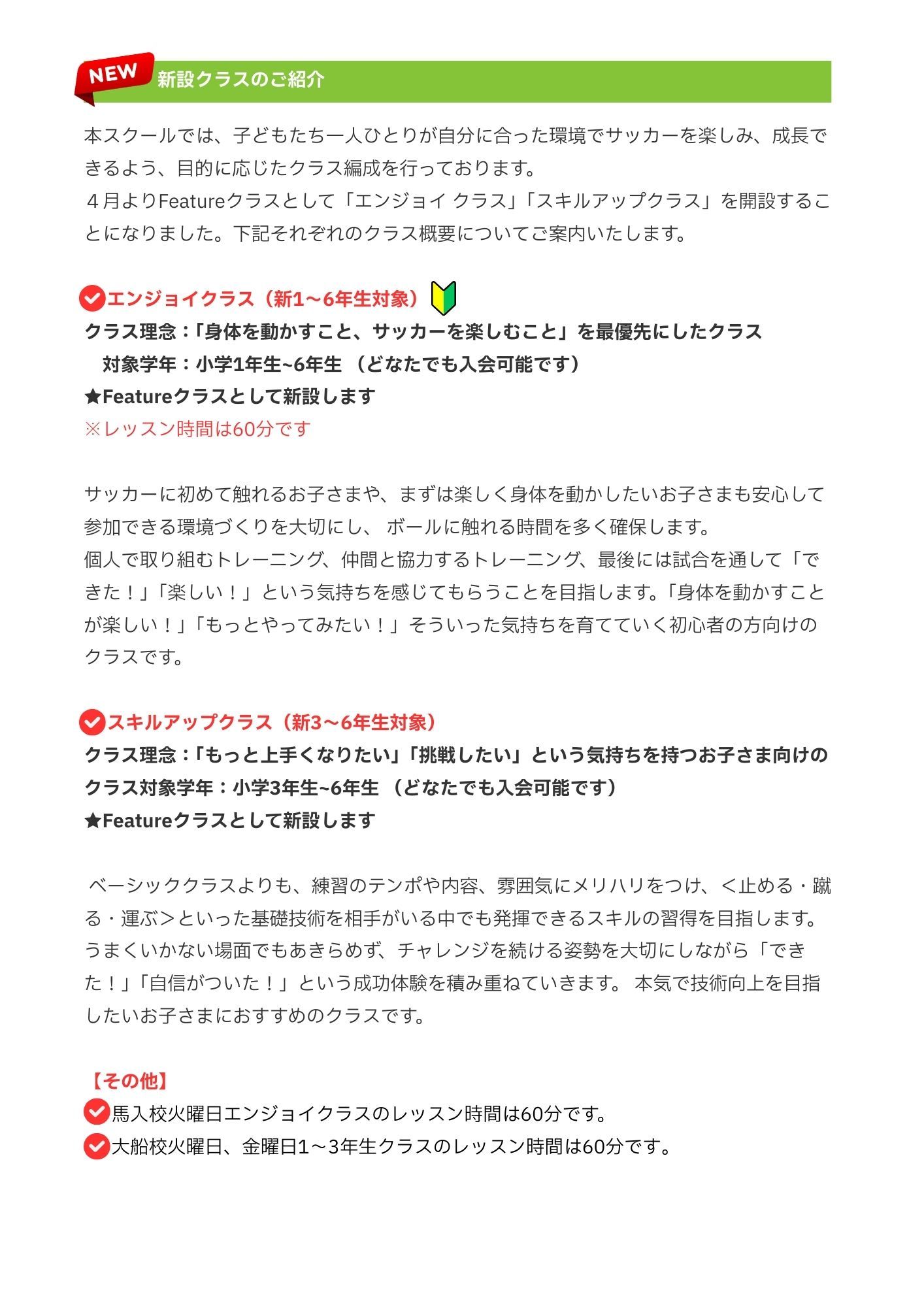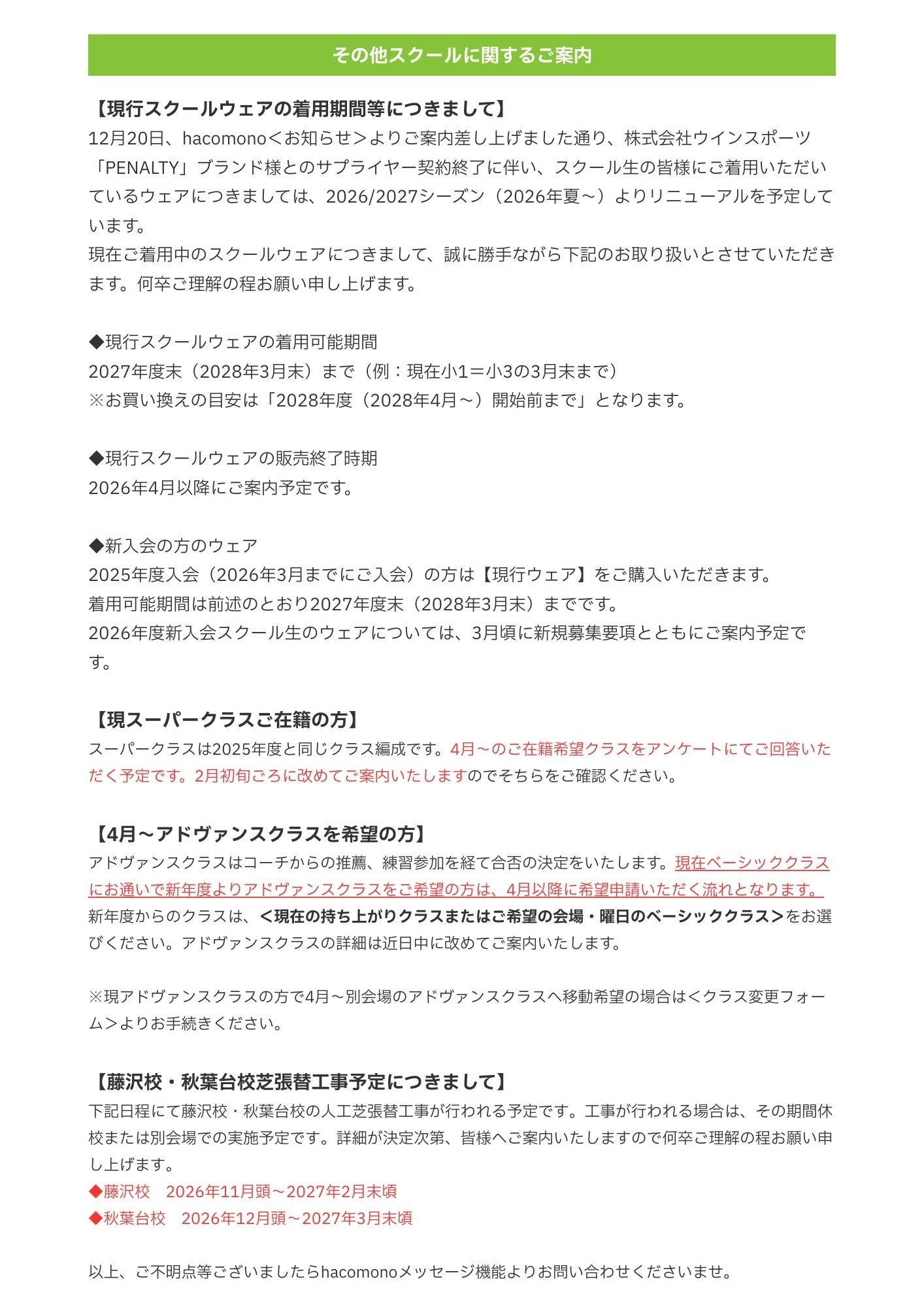 その他ご案内事項や新設クラスに関するご案内は、添付資料をご確認いただきご不明点は<メッセージ機能>よりお問い合わせくださいませ。
