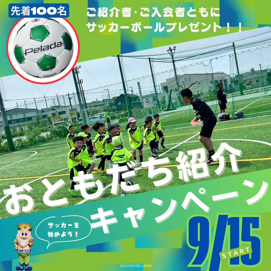 9月15日(月)~11月30日(日)まで、ベルマーレサッカースクールにお通いのスクール生と秋からサッカーをスタートしたいお友達を対象に「おともだち紹介キャンペーン」を実施いたします!